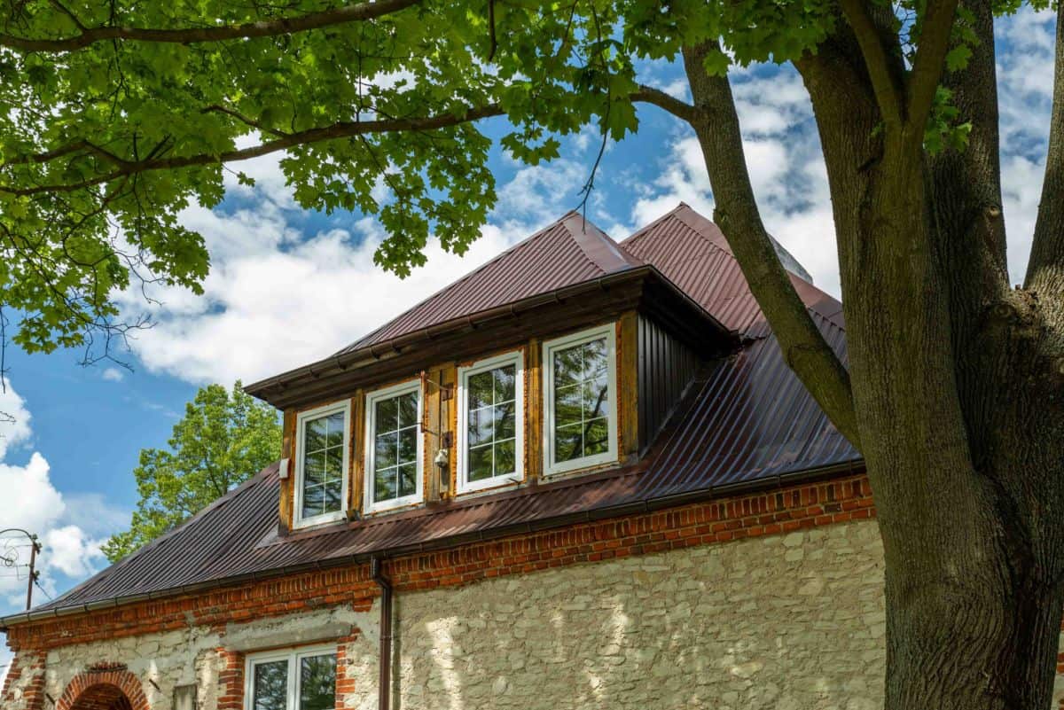 Dwuspadowy dach pokryty jest ciemnobrązową blachą, która harmonizuje z ceglanymi elementami elewacji. Budynek posiada wiele dużych okien, które zapewniają doskonałe doświetlenie wnętrz i podkreślają przestronność pomieszczeń. Wejście główne, osłonięte łukowym portalem, dodaje charakterystycznego akcentu architektonicznego.